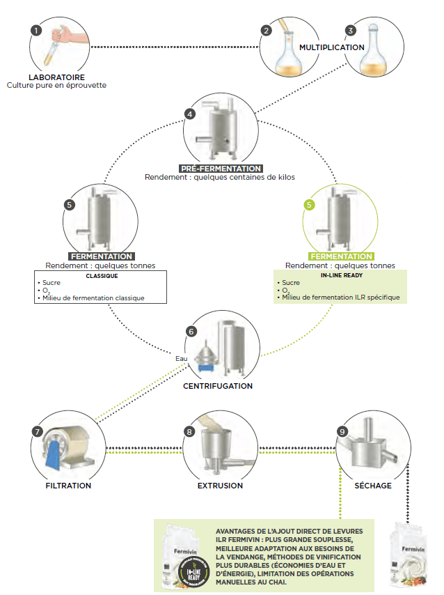 Voici le processus de production des levures Fermivin, soulignant la différence entre la production classique de Fermivin, à utiliser après réhydratation, et le processus In-Line Ready Fermivin, qui permet une utilisation directe.