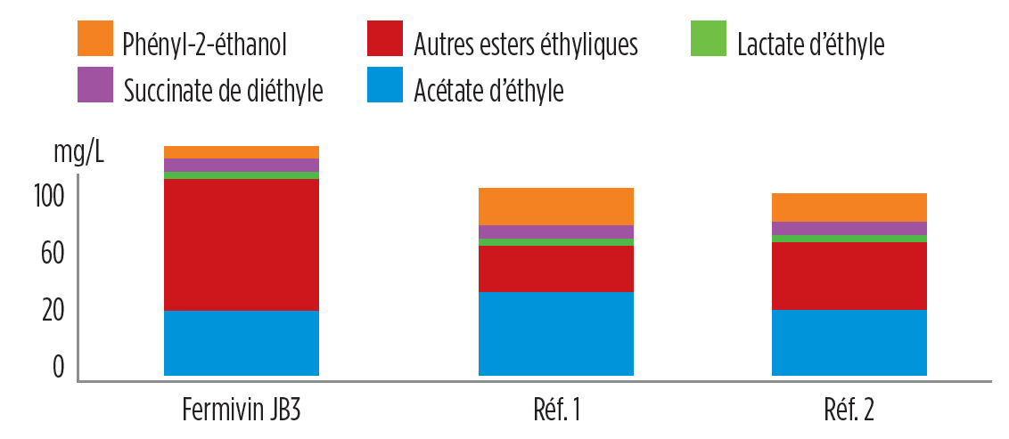 Le métabolisme de Fermivin JB3 favorise une forte production d’esters d’alcools supérieurs de type acétate de phényl-2-éthanyl (rose, miel) et acétate d’isobutyle (ananas).
