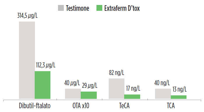 Extraferm D’tox can also bind and eliminate over 50% of undesirable molecules such as ochratoxin A (OTA), unpleasant aroma molecules such as anisoles (TCA, TeCA, TBA, and PCA), and dibutyl phthalate.