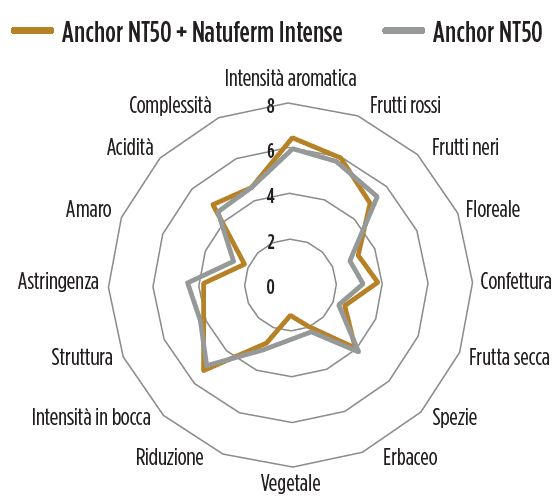 I vini fermentati con Natuferm Intense presentano una maggiore ricchezza di composti aromatici rispetto ai vini di controllo vinificati senza aggiunta di nutrienti, contribuendo alla complessità del vino finito e conferendogli una maggiore longevità aromatica.