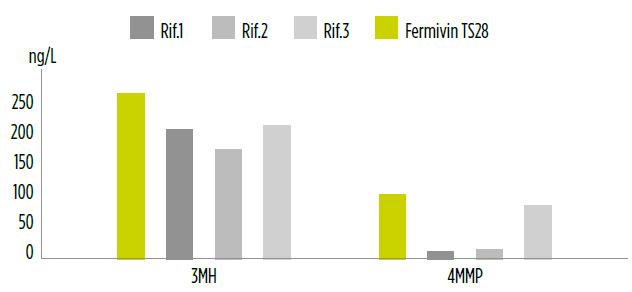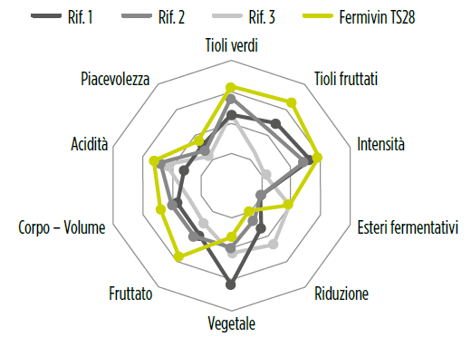 Grazie alla sua attività β-liasi, Fermivin TS28 è molto efficace nel valorizzare gli aromi varietali, in particolare 3MH e 4MMP.