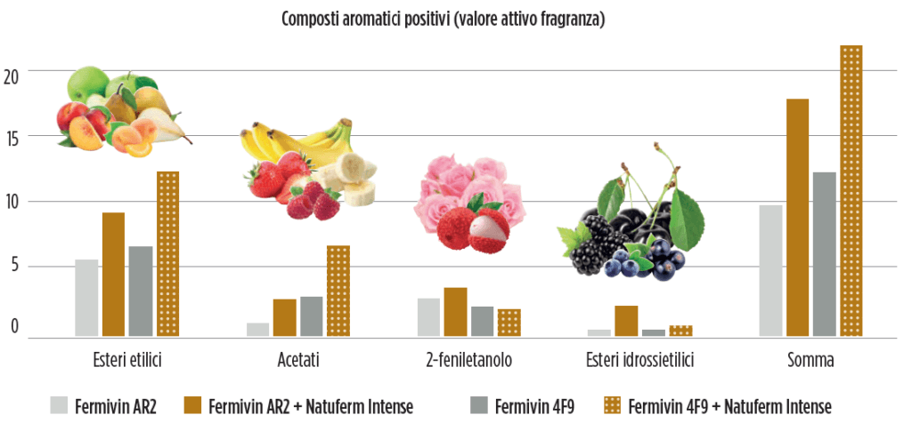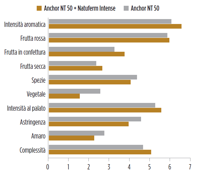 Con Natuferm Intense, la diversità dei composti aromatici aumentati contribuisce positivamente al profilo aromatico e dona complessità al vino. I livelli di esteri etilici sono più elevati, quindi aumenta la persistenza aromatica.
