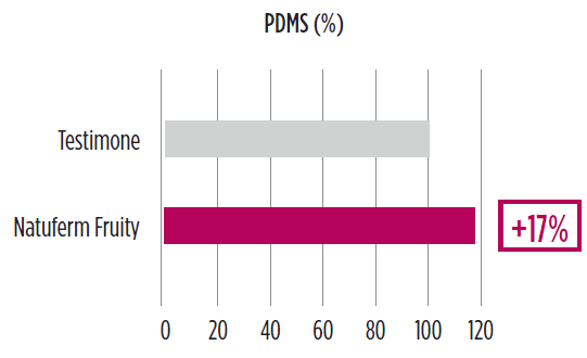 Natuferm Fruity è stato sviluppato per aumentare la fruttuosità e preservarla nel tempo nei vini rossi. Il lievito autolisato selezionato in Natuferm Fruity presenta una ricchezza in amminoacidi, precursori degli esteri fermentativi, e consente la conservazione del PDMS (potenziale di dimetilsolfuro), poiché viene meno “consumato” dai lieviti, con l’ulteriore vantaggio del contenuto naturale di ergosterolo, essenziale per proteggere la membrana cellulare dei lieviti e garantire la loro capacità di assorbire nutrienti come gli amminoacidi.