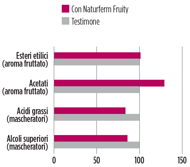 I vini rossi fermentati con Natuferm Fruity sono più ricchi in aromi fruttati (esteri e acetati), e l’intensità aromatica è maggiore grazie alla ridotta presenza di composti che mascherano l’aroma, come acidi grassi e alcoli superiori. Si nota anche una migliore conservazione dell’intensità fruttata nel tempo.