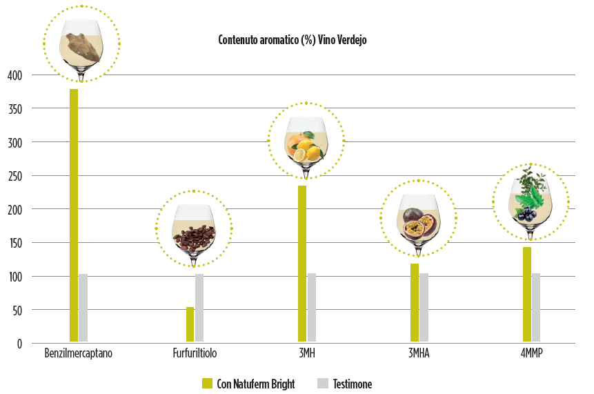 Di conseguenza, con Natuferm Bright puoi scegliere se concentrarti sui tioli e sul loro rilascio oppure aumentare la produzione di esteri e il rilascio di tioli. Il primo obiettivo richiede un’unica aggiunta del prodotto all’inoculo dei lieviti, mentre il secondo si ottiene con due aggiunte: all’inoculo e dopo 1/3 della fermentazione.