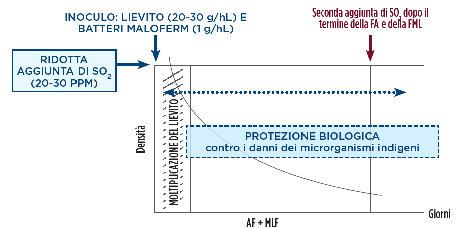 La fermentazione malolattica con co-inoculazione è una tecnica che consiste nel co-inoculare un mosto con lieviti e fermenti malolattici. Accelera in modo significativo il completamento della fermentazione malolattica. Questo risparmio di tempo può essere decisivo per i vini giovani e per i vini con pH elevato ( >> 3,6) e può limitare il rischio di deviazioni dovute ai batteri lattici o a contaminazioni da lieviti.