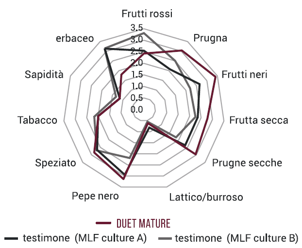 | Duet Mature | Struttura, frutta scura, spezie | Vini rossi strutturati e rotondi | Fino al 16% pH ≥ 3.3 Temp. 18-28 °C |
