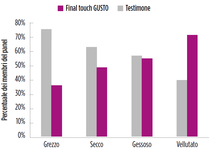 Un altro modo per sfruttare al meglio le mannoproteine nel vino è l’aggiunta di mannoproteine estratte dal lievito e proposte come prodotti pronti all’uso, come Claristar e Final touch, che contribuiscono alla stabilizzazione tartarica e presentano un forte impatto organolettico. È disponibile una gamma completa di prodotti con diverse applicazioni a seconda del ceppo di lievito e del processo di estrazione utilizzato. Un buon esempio dell’impatto di tale mannoproteina è illustrato dall’effetto dell’aggiunta di Final touch GUSTO sulla percezione del tannino.