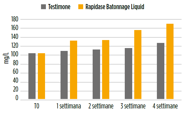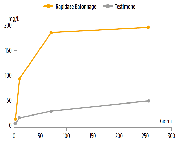 Anche se l’autolisi è un fenomeno naturale che si verifica dopo la fermentazione alcolica, può essere accelerata utilizzando enzimi β-glucanasi. Questi enzimi possono degradare la parete cellulare del lievito poiché sono in grado di idrolizzare i β-glucani che costituiscono la parete cellulare. Si può osservare l’effetto dell’aggiunta di glucanasi, come Rapidase Batonnage, sul rilascio di mannoproteine. Il rilascio di mannoproteine durante l’affinamento sulle fecce contribuisce a ridurre l’astringenza del vino, aumentare l’untuosità e il mouthfeel, ma anche alla stabilizzazione tartarica, proteica e colloidale.