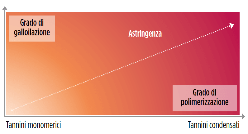 Ovviamente, la composizione dei tannini è un punto fondamentale, e i processi enologici contribuiscono fortemente alla composizione finale dei tannini, attraverso reazioni di addizione, ossidazione, polimerizzazione e aggregazione delle forme native. Tuttavia, il vitigno può influenzare il profilo delle diverse famiglie fenoliche e quindi la composizione finale dei tannini nel vino e le proprietà sensoriali che essi determinano. Da notare che maggiore è il grado di polimerizzazione e gallocilazione dei tannini, maggiore sarà l’astringenza.